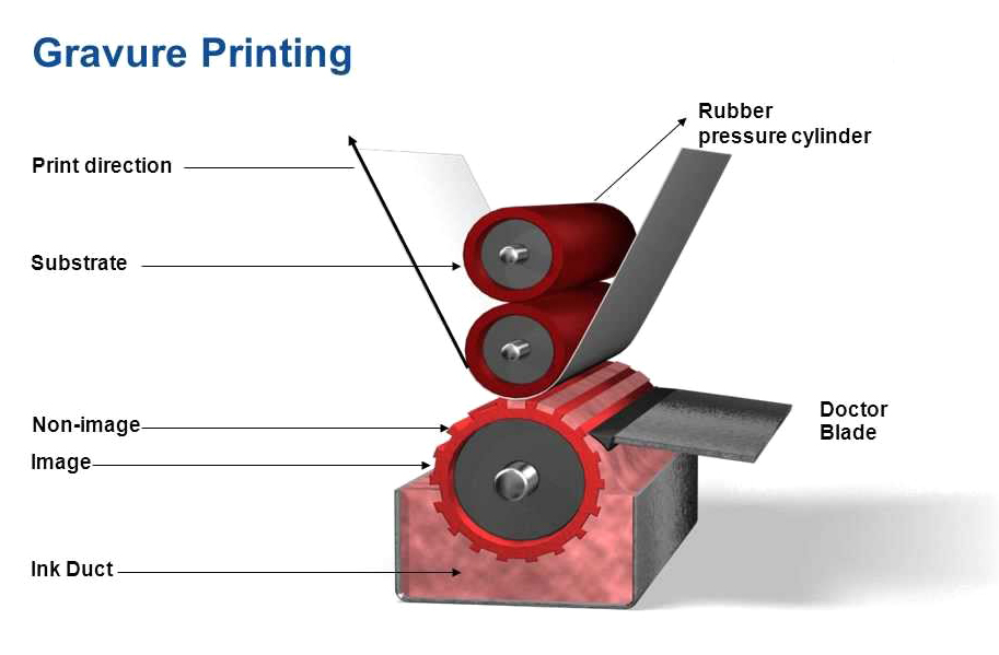 Basics of the Gravure Printing ProcessGravure is small cells recessed into a cylinder that hold ink. The cylinder is washed with ink; a doctor blade removes the excess, leaving ink only in the cells. The ink is transferred to a substrate (paper, plastic, film, and more) using a rotary press. |